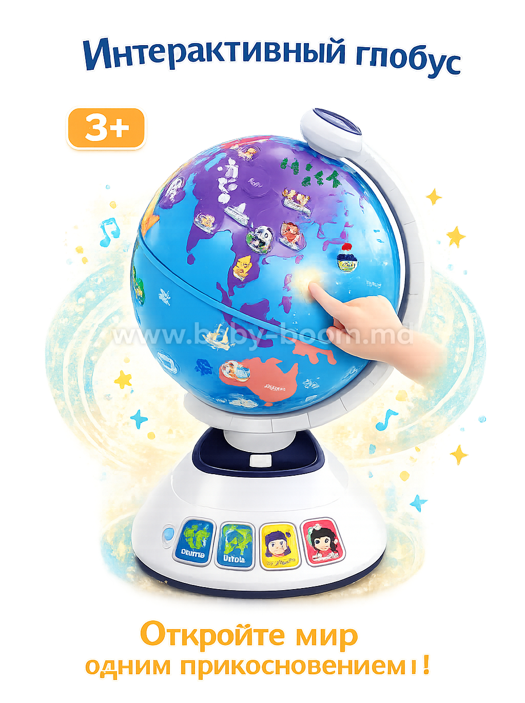 Descoperă lumea cu o singură atingere! Acest glob interactiv cu 48 de puncte tactile îi introduce pe cei mici în fascinanta lume a geografiei, culturii, animalelor, limbilor străine și muzicii. Conceput pentru a stimula gândirea, dezvoltarea cognitivă și interesul pentru cunoaștere, globul oferă ore întregi de joacă educativă și interactivă.
