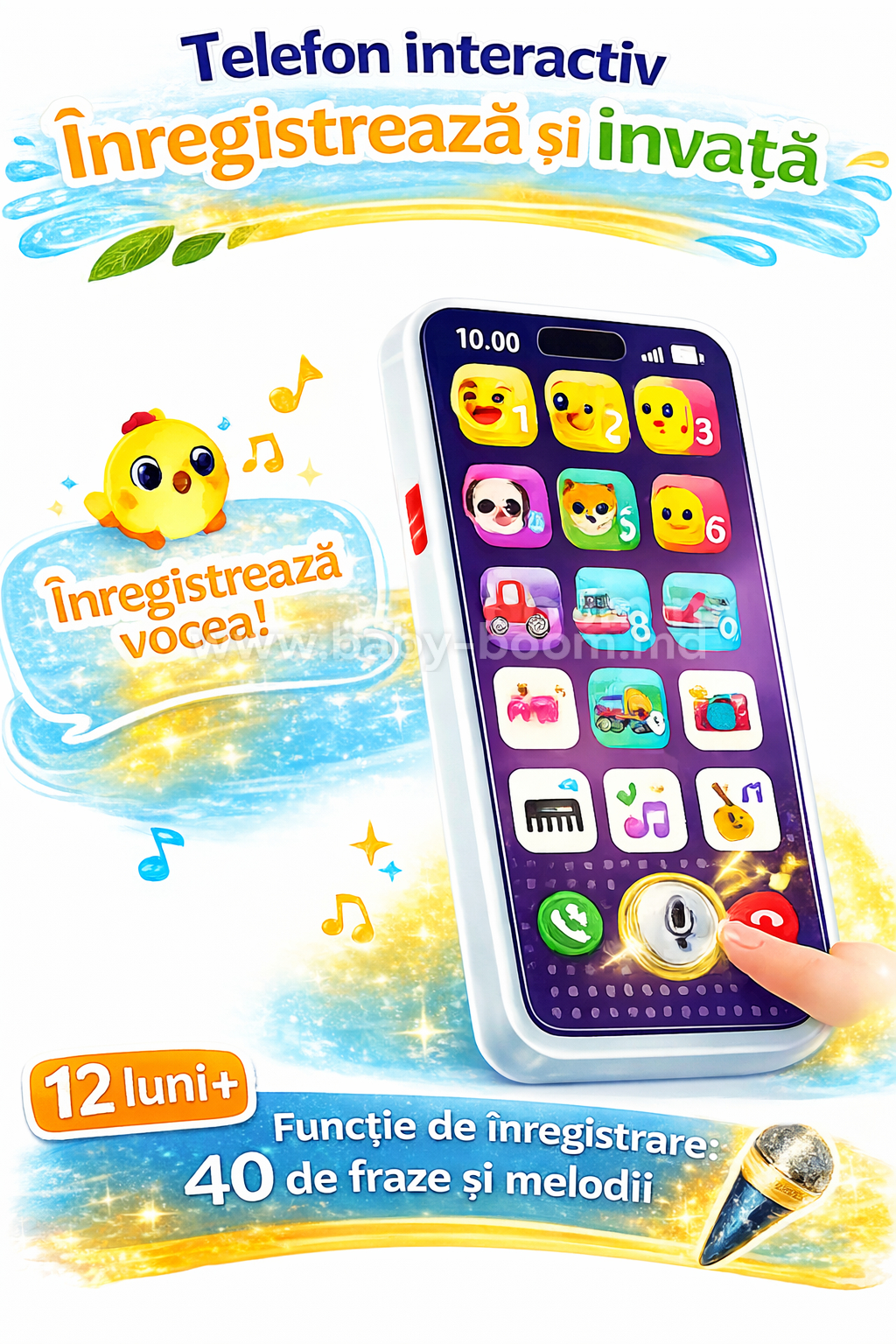 Funcția de înregistrare și redare este deosebit de atractivă: copiii pot înregistra un sunet sau o voce și apoi o pot reda, o modalitate excelentă de a stimula vorbirea și exprimarea creativă. Există, de asemenea, moduri de „jocuri cu telefonul” (interpretare de rol), precum și conținut muzical (melodii și sunete) care captează atenția și dezvoltă percepția auditivă.