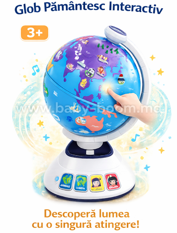 Descoperă lumea cu o singură atingere! Acest glob interactiv cu 48 de puncte tactile îi introduce pe cei mici în fascinanta lume a geografiei, culturii, animalelor, limbilor străine și muzicii. Conceput pentru a stimula gândirea, dezvoltarea cognitivă și interesul pentru cunoaștere, globul oferă ore întregi de joacă educativă și interactivă.