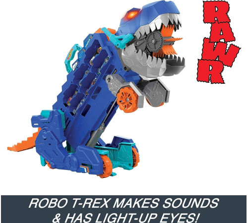 Partea din spate a lui T-Rex este o pistă de curse cu două benzi. Merge pe spate cu mașinile Hot Wheels® incluse; câștigătorul merge mai departe, iar locul secund este „aruncat” din dinozaur.