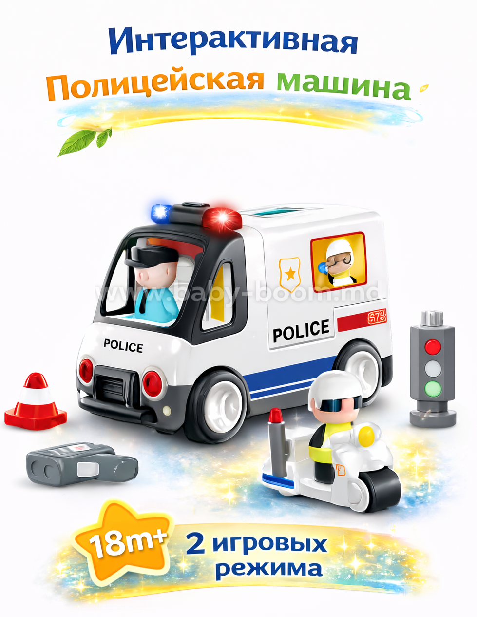Mașina de Poliție este un set interactiv și educativ conceput special pentru copiii cu vârsta cuprinsă între 1,5 și 5 ani. Setul include o mașină de poliție, o figurină de ofițer de poliție, o motocicletă și semafoare, oferind material bogat pentru jocul de rol și învățare.
