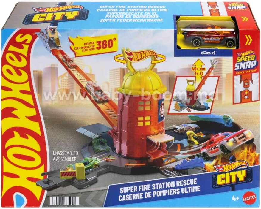Setul de joacă Hot Wheels Fire & Rescue Super Station este conceput pentru curse dinamice și misiuni narative într-un „oraș” unde salvatori curajoși sunt întotdeauna necesari. Intră în stație, lansează rampele și descoperă cum să ajungi rapid la locul faptei.