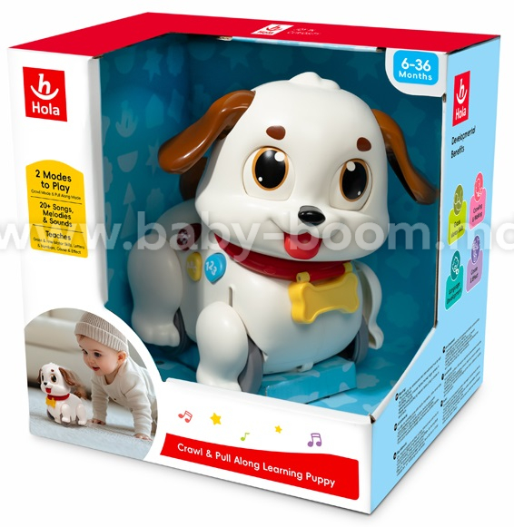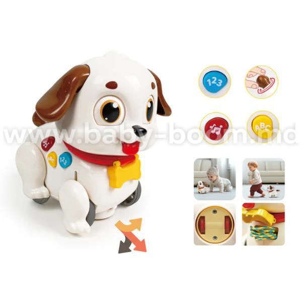 Cățeluș interactiv de la HOLA TOYS — o jucărie distractivă și educativă pentru copii de la 6 luni. Cățelușul se deplasează singur, încurajând copilul să se târască după el, sau poate fi tras cu ajutorul unui șnur special. În timpul mișcării, cățelușul își mișcă vesel urechile și coada, luminează și scoate sunete care atrag atenția și stimulează dezvoltarea motricității, coordonării și percepției senzoriale.