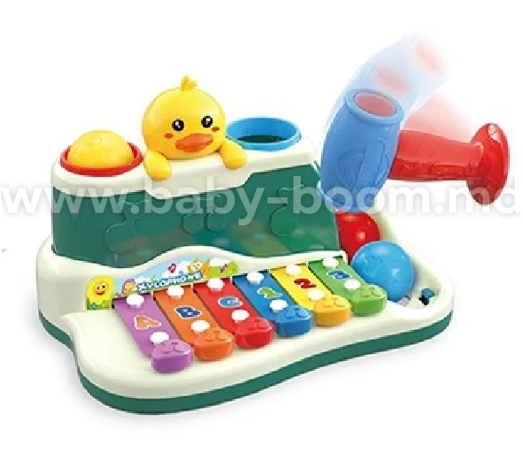 Jucăria muzicală educativă tip xilofon este destinată copiilor mici și combină mai multe activități într-o singură jucărie. Copilul poate cânta la xilofon, poate adăuga bilele și le poate lovi cu ciocănelul, descoperind sunete și mișcare.