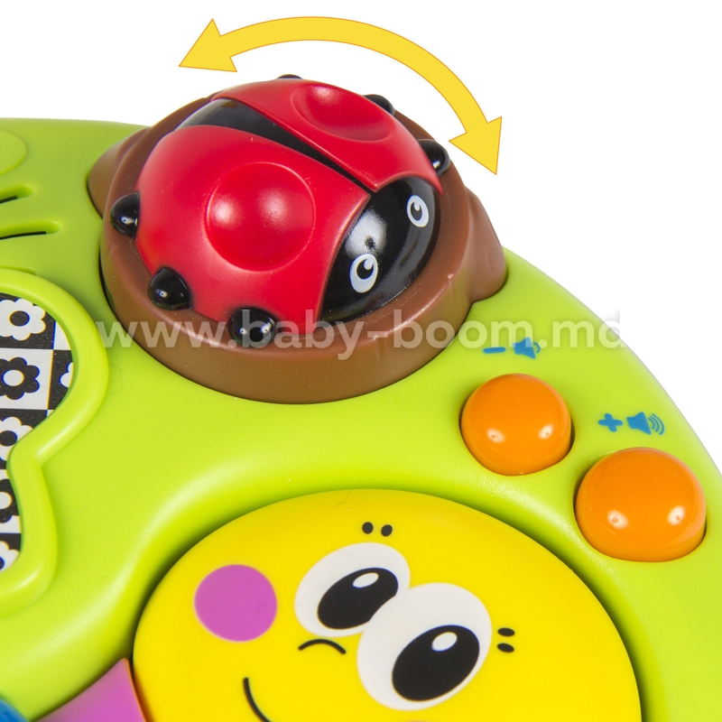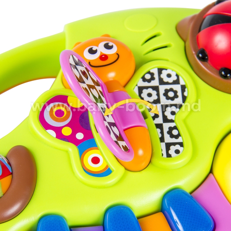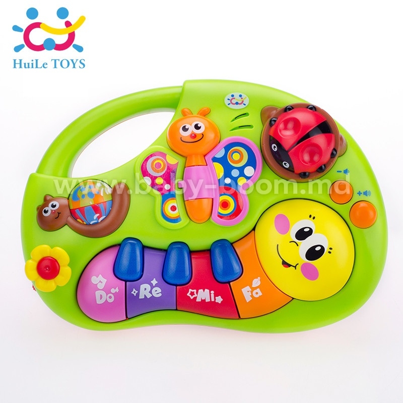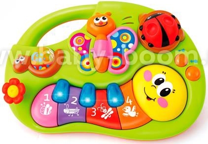 Jucărie "Pian amuzant" cu efecte luminoase și sonore este un centru de jocuri care îi va ajuta pe copil să dezvolte nu numai percepția muzicală, ci și abilitățile motorii fine ale mâinilor. Floare, melc, fluture, buburuza stimulează efectua diverse mișcări - rotație, prindere, deținerea etc. Viermele pian de joc are două moduri: mod №1 clape de pian corespund notelor do, re, mi, fa ;. în modul №2 patru taste corespund celor patru stiluri muzicale - cantry, rock, jazz, clasic. Butoanele de volum vă vor ajuta să alegeți un nivel confortabil de sunet.
