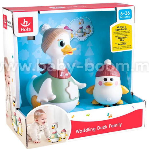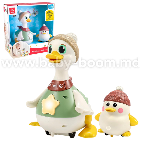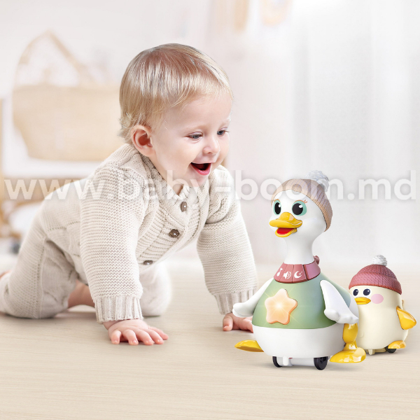 Adorabila mamă-rață balansantă cu rățușca de la HOLA TOYS este un set de joacă creat special pentru copiii de la 6 luni. Acesta combină două moduri de joc, lumini colorate, muzică veselă și mișcări line, încurajând copilul să fie activ și susținând dezvoltarea lui.
