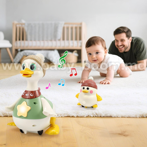 Mod „GO” — rața se mișcă, se balansează, redă muzică și luminează, încurajând copilul să se târască și să se miște.