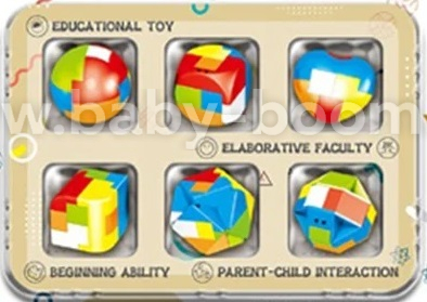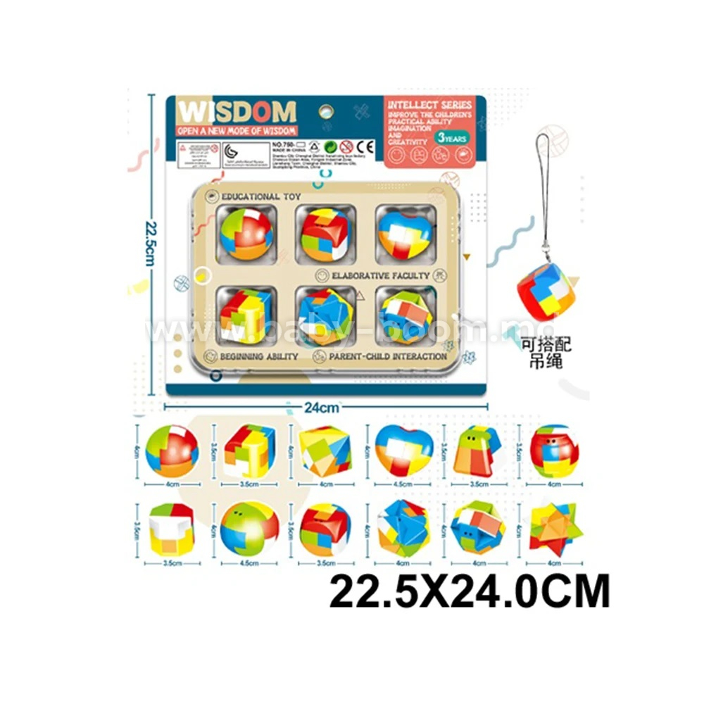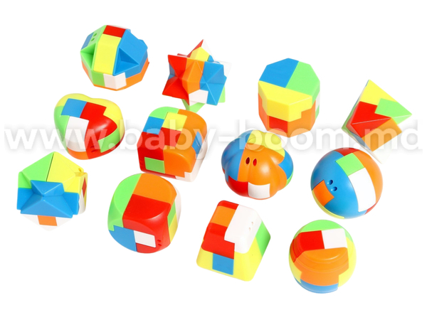 Include 6 puzzle-uri unice, deblocabile și interconectabile, în diferite forme, cum ar fi cuburi și bile.