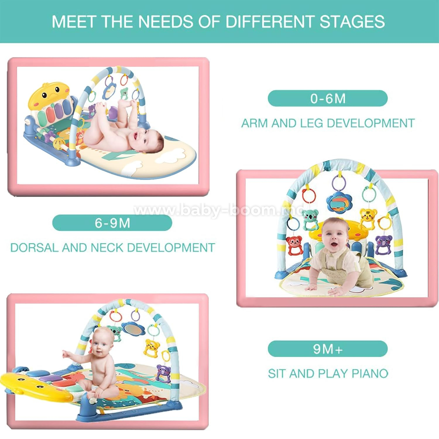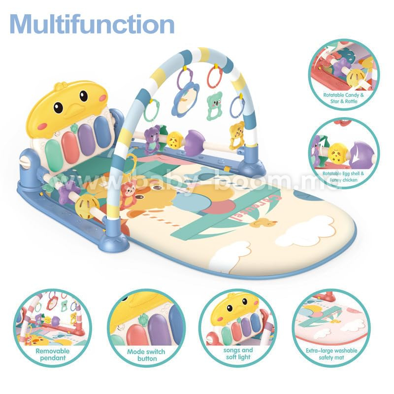 - Un pian cu funcție de pedală și muzică veselă pentru copii încurajează bebelușii să dea constant din picioare. Covorașele de joacă ajută, de asemenea, la dezvoltarea mușchilor brațelor, picioarelor, abdomenului, spatelui și gâtului, stimulând coordonarea mișcărilor și abilitățile motorii fine și grosiere.