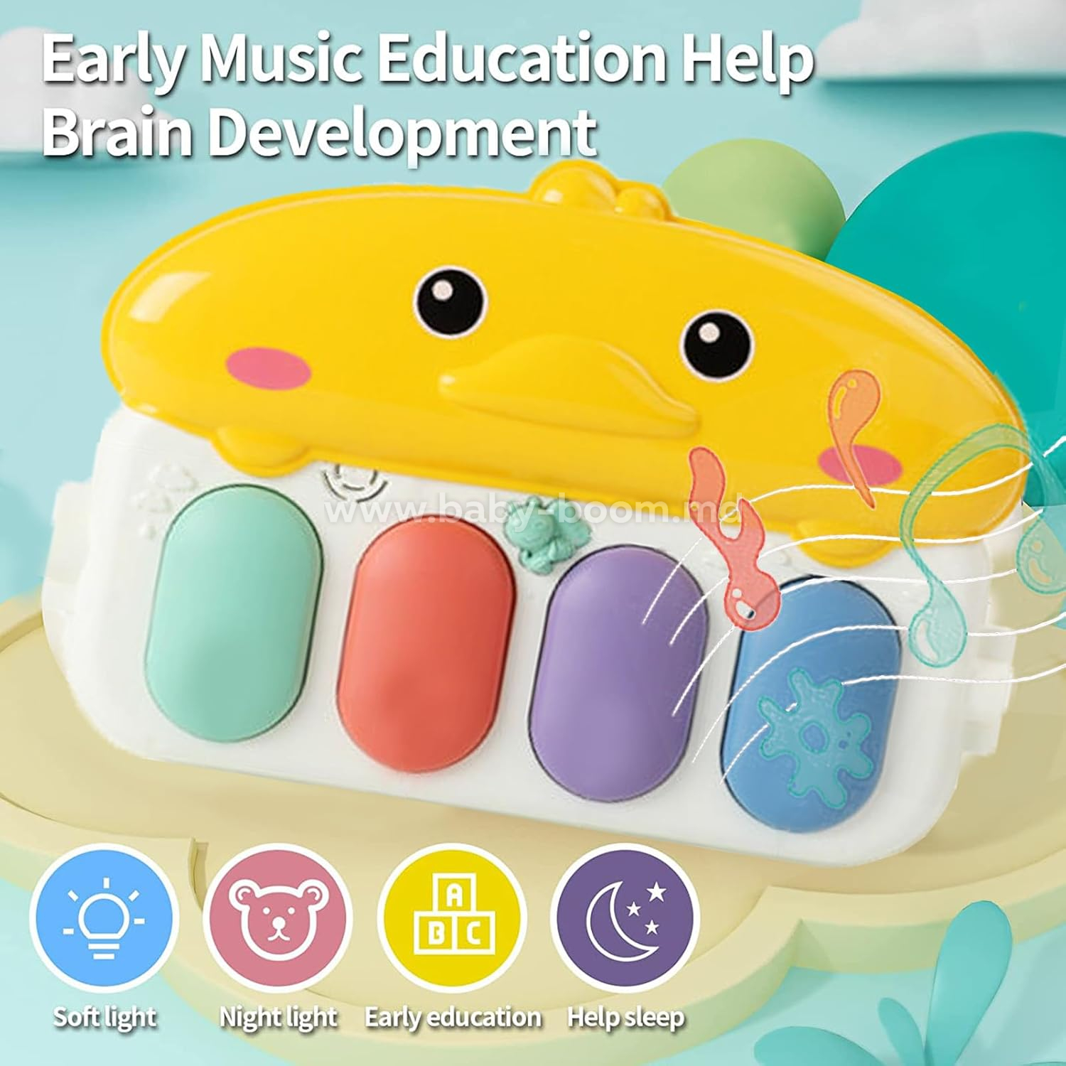 - Iluminarea LED încorporată a pianului protejează vederea bebelușului și promovează dezvoltarea percepției vizuale. Luminile strălucitoare pâlpâitoare fac jocul mai interesant și mai captivant.