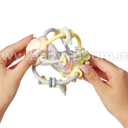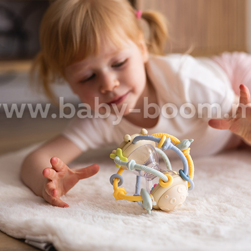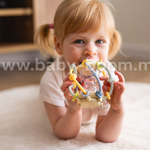 Jucăria senzorială Clepsidră este o combinație între un accesoriu de dentiție moale și o zornăitoare. Am conceput-o având în vedere curiozitatea bebelușilor. Se potrivește perfect în mânuțele mici. Accesoriul de dentiție colorat, cu creste moi, masează plăcut gingiile bebelușului și ușurează erupția dentară. Clepsidra transparentă cu bile colorate zornăie ușor. Bebelușul poate mișca piesele mobile de-a lungul tijelor de silicon și poate roti roata din partea de jos. Este atât de distractiv! Accesoriul de dentiție și zornăitoarea stimulează simțurile și dezvoltă coordonarea mână-ochi. Am realizat-o din silicon non-toxic și polipropilenă pentru a asigura o joacă în siguranță încă din primele luni de viață!
