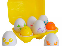 Jocul distractiv de sortare îl va distra pe orice micuț, fiecare ou având un miez de formă diferită, cu o fantă corespunzătoare în cutia de ouă, iar unirea cojilor permite, de asemenea, exersarea în potrivirea culorilor.