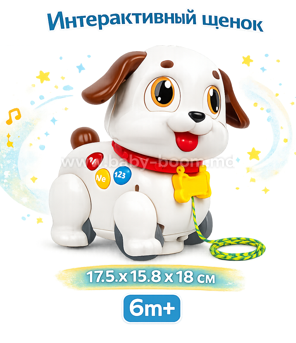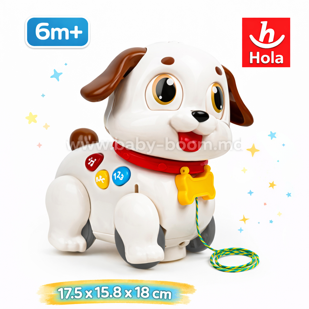 Cățeluș interactiv de la HOLA TOYS — o jucărie distractivă și educativă pentru copii de la 6 luni. Cățelușul se deplasează singur, încurajând copilul să se târască după el, sau poate fi tras cu ajutorul unui șnur special. În timpul mișcării, cățelușul își mișcă vesel urechile și coada, luminează și scoate sunete care atrag atenția și stimulează dezvoltarea motricității, coordonării și percepției senzoriale.
