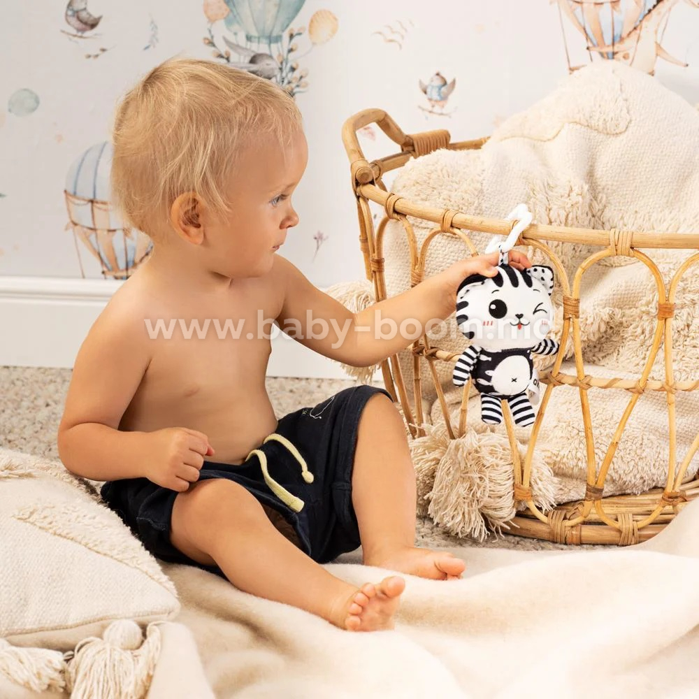 Culorile contrastante stimulează vederea unui bebeluș care încă nu distinge culorile. Produsul este fabricat dintr-un material moale care nu permite copilului să se despartă de el. Dezvoltă coordonarea vizual-auditivă și motorie a bebelușului.