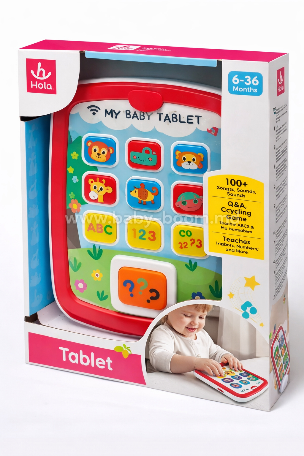 Tableta Hola este special conceputa pentru bebelusii de la 6 luni. Hola are efecte sonore și lumini intermitente pentru a stimula curiozitatea și simțurile copilului și pentru a ajuta la dezvoltarea abilităților cognitive.