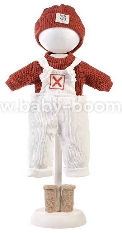 Include: o salopetă albă cu un pulover roșu, o căciulă și șosete.