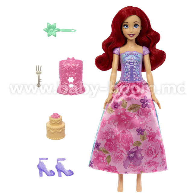 Păpușa Ariel are părul lung și poartă un corset mulat și o fustă reversibilă. Folosește accesorii (un corset, o pereche de pantofi și un ac de păr) pentru a decora păpușa și detalii tematice (o furculiță și o prăjitură) pentru a crea teme mai jucăușe.