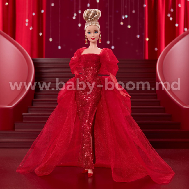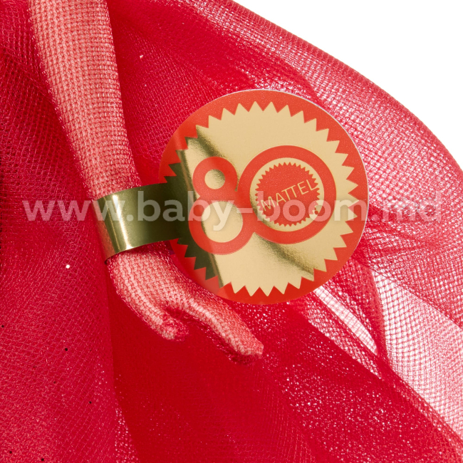 Barbie strălucește într-o rochie luxoasă cu paiete roșii, împodobită cu mâneci bufante și o trenă peplum dramatică. Aspectul este completat de pantofi de culoarea rubinului, cercei mari aurii cu litere M - o aluzie la sigla clasică Mattel - precum și de un coc și un ruj stacojiu. Manichiura ei roșie se vede printre mănușile translucide, adăugând o notă de șic modern.