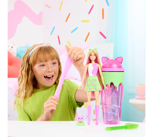 Un cadou ascuns în slime va adăuga un element de surpriză jocului (decor de paie). Apoi, scoateți filmul din ceașcă pentru a dezvălui mai multe surprize, cum ar fi o păpușă Barbie cu părul mirositor și 5 obiecte de joacă suplimentare.