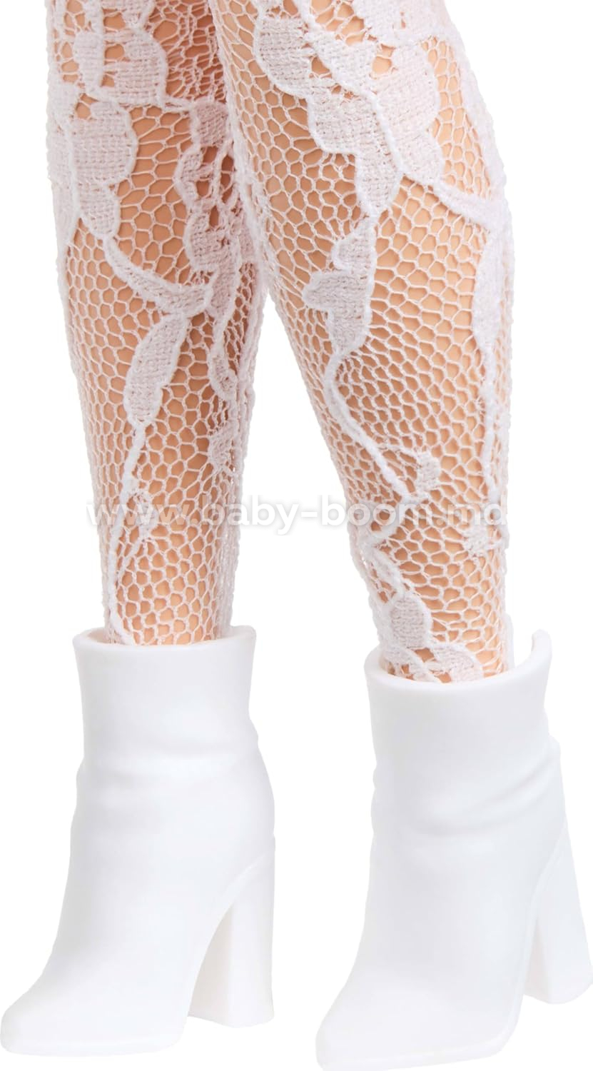• Această păpușă la modă este poziționabilă și poartă haine detașabile: o rochie elegantă cu imprimeu cu inimioare, colanți din dantelă, o curea cu cuvântul „BARBIE” și cizme strălucitoare!