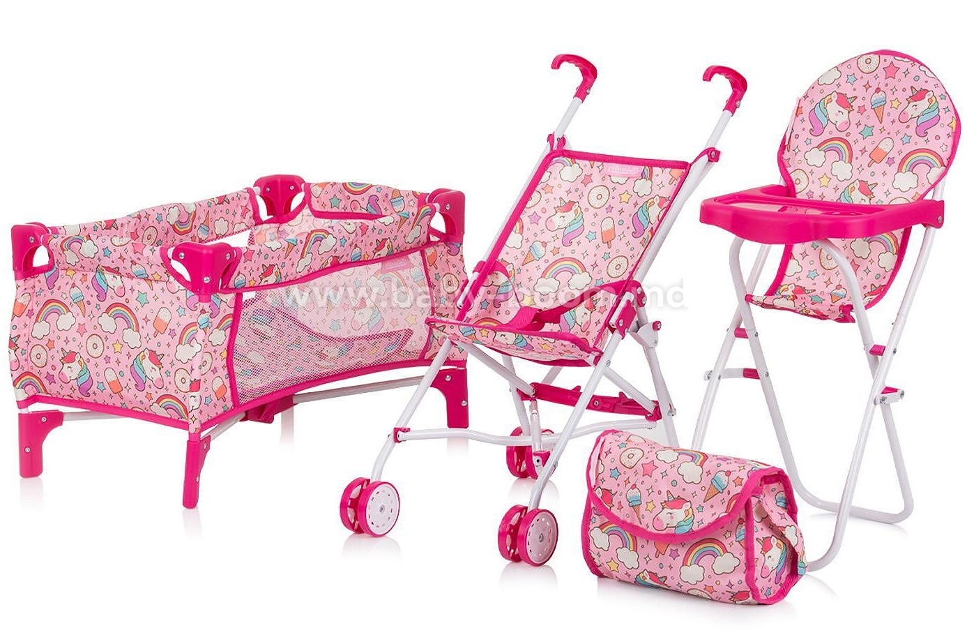 Setul include un cărucior pentru păpuși, o geantă pentru accesorii, un scaun înalt pentru copii, un pătuț pentru păpuși și o geantă de transport pentru pătuțul pentru păpuși;