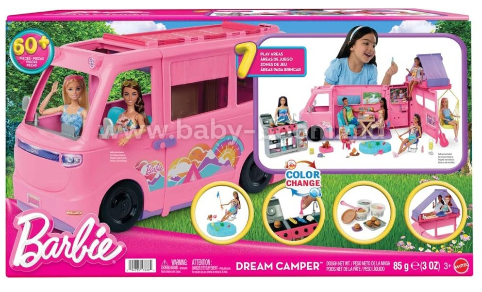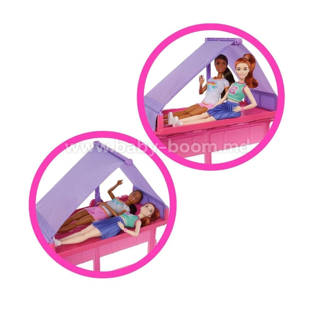 Rulota se rostogolește ușor - trebuie doar să o închideți și să ieșiți afară. Când este timpul să vă jucați, desfaceți-o pentru a dezvălui o lume a aventurii: un cort pliabil pe acoperiș, cu loc pentru două păpuși, o cameră de zi, o zonă de luat masa și o baie. Vă așteaptă activități distractive, inclusiv pescuit în iaz, relaxare în fotoliul suspendat, picnic la masă, un grătar și chiar un pat confortabil pentru căței.