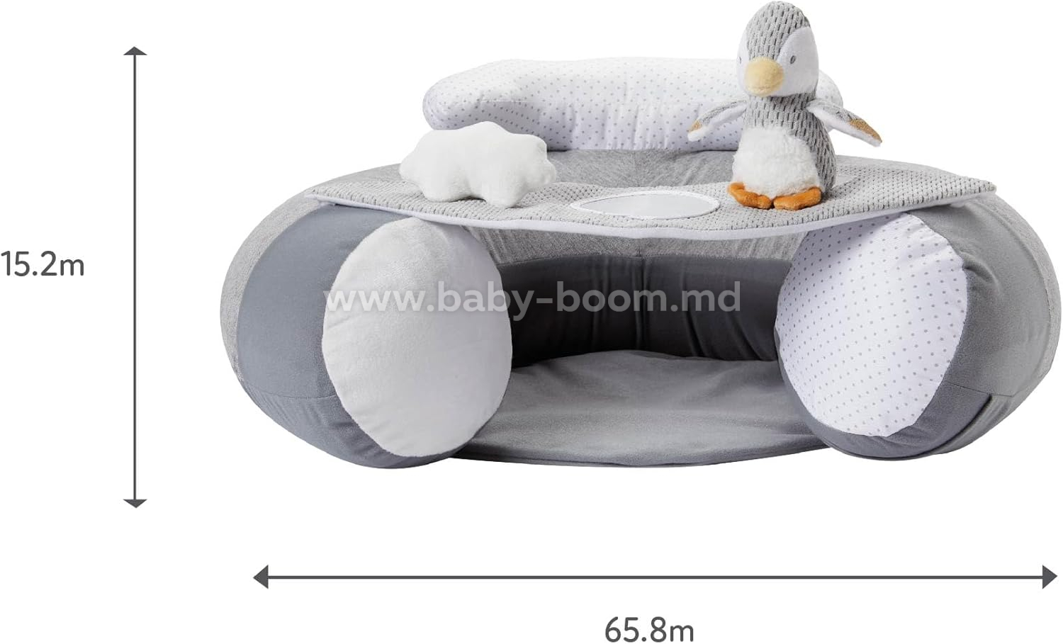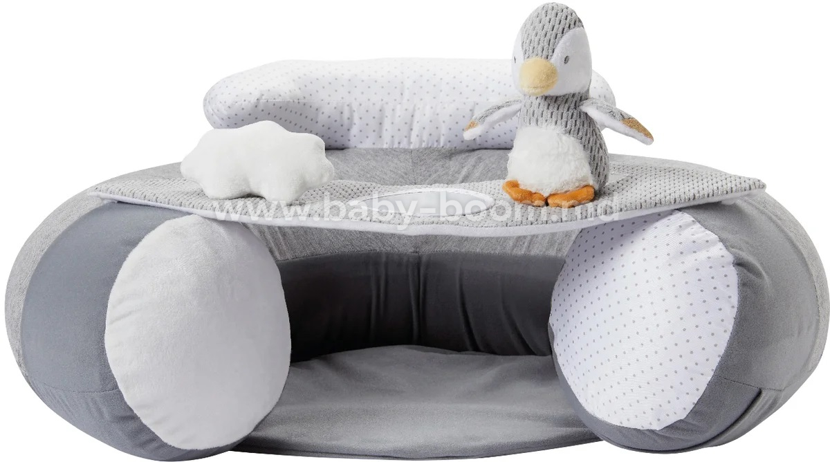 JUCĂRII PENTRU BEBELUȘI - Tavă detașabilă cu jucării interactive, inclusiv un pinguin cu zornăitoare, un nor moale de pluș și o oglindă pentru explorarea reflexiilor.