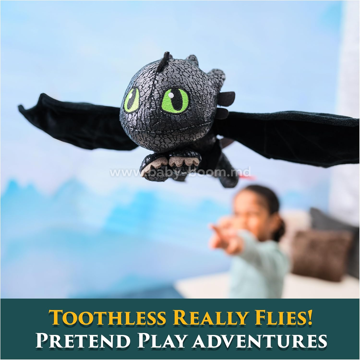 - Aripi de îmbrățișat: Și Toothless adoră să se cuibărească. După un zbor palpitant, aripile mari și întinse de pluș ale acestui dragon se pocnesc și se curbează spre interior pentru a-ți îmbrățișa mâna, pentru o joacă senzorială distractivă. Jucăria nu se poate spăla la mașină; ștergeți doar ușor zonele murdare.