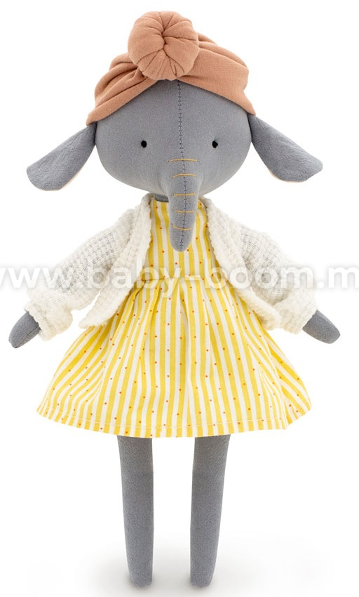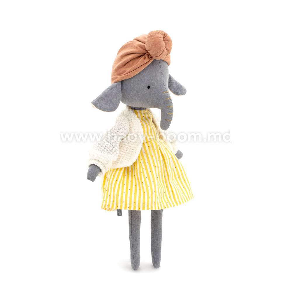 Elefantul Alice este cel mai frumos dintre toți elefanții din lume! Îi place să se îmbrace și să vină cu imagini neobișnuite. Alice poartă o rochie galbenă strălucitoare și o bluză albă împletită mare. Pe cap este un turban pudrat la modă. Hainele sunt confectionate din bumbac organic 100% si sunt complet detasabile.