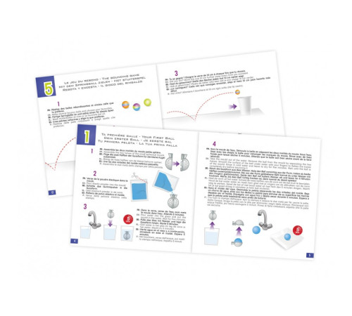Include: pudră elastică roșie, pudră elastică albastră, pudră elastică portocalie, pudră elastică violet, pudră elastică fosforescentă, 1 matriță sferică mică, 1 matriță sferică mare, 1 matriță cub, 2 pungi de depozitare, instrucțiuni colorate ilustrate.
