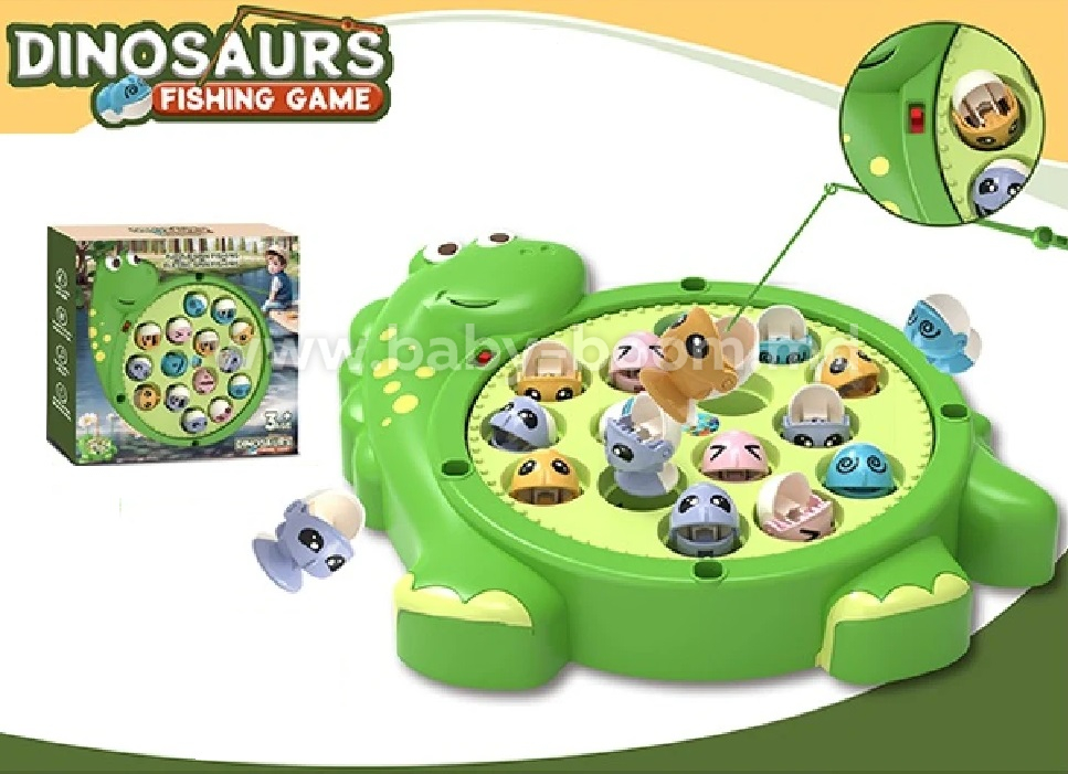 Setul de joacă „Pescuit cu dinozauri” este un joc educativ și distractiv pentru copii de la 3 ani. Platforma colorată, în formă de dinozaur, are figurine rotative cu guri care se deschid, ce trebuie prinse cu ajutorul undițelor.