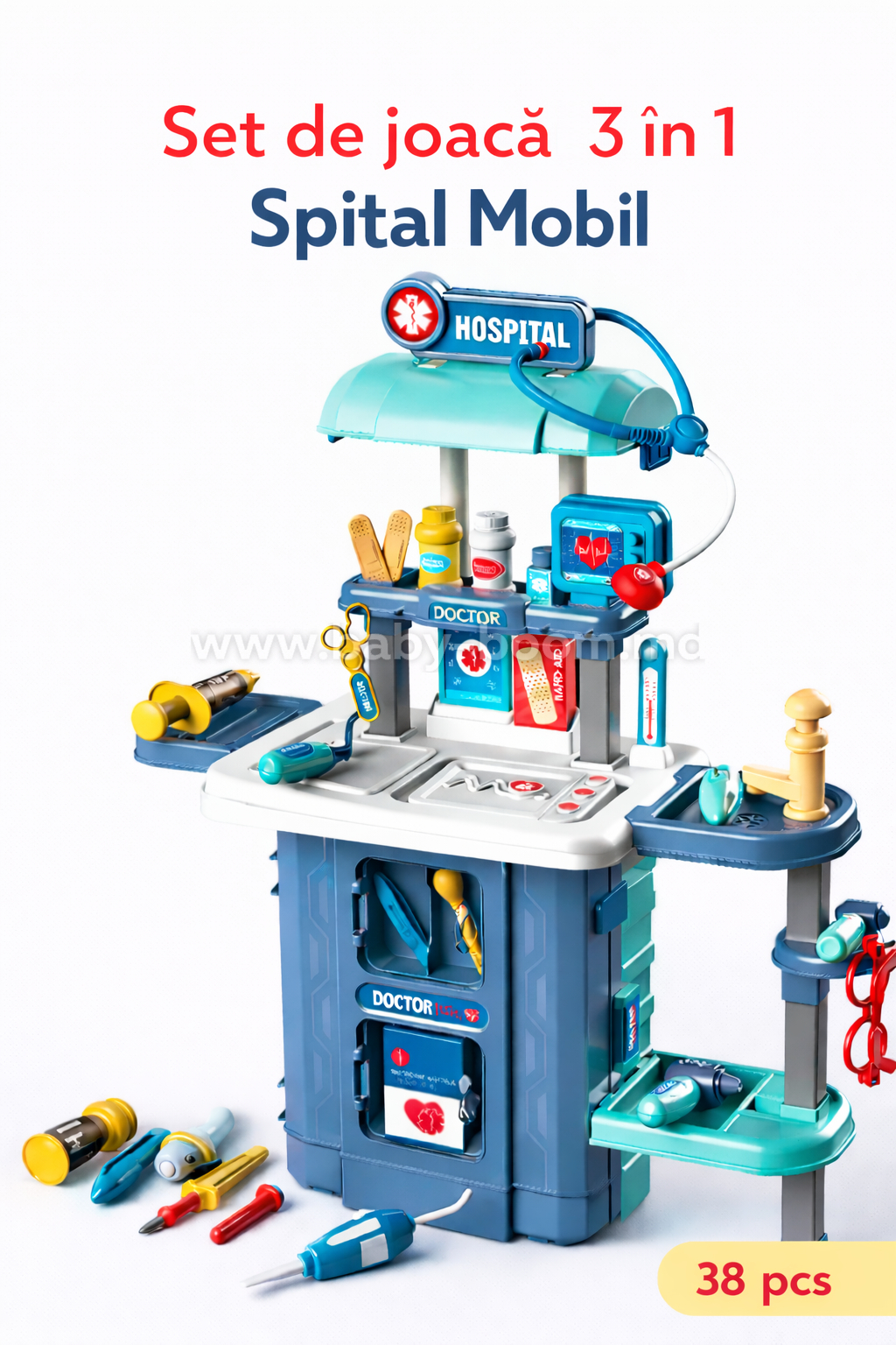 Set de joacă interactiv și educativ „Spital Mobil” cu diverse jucării și accesorii, prin care copiii pot învăța mai multe despre profesia de medic, echipamentele medicale și viața de zi cu zi. Funcție 3 în 1: se poate transforma în valiză, stație de masă cu instrumente medicale sau într-un adevărat cabinet medical mobil.