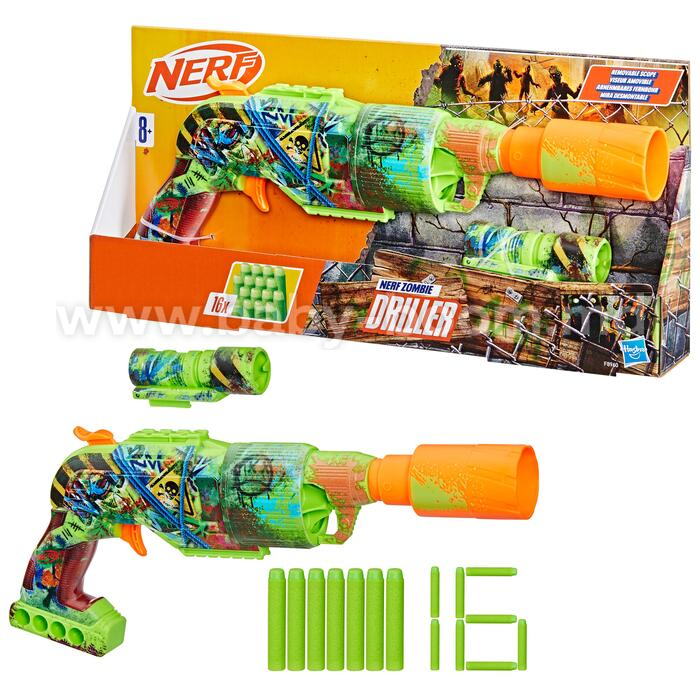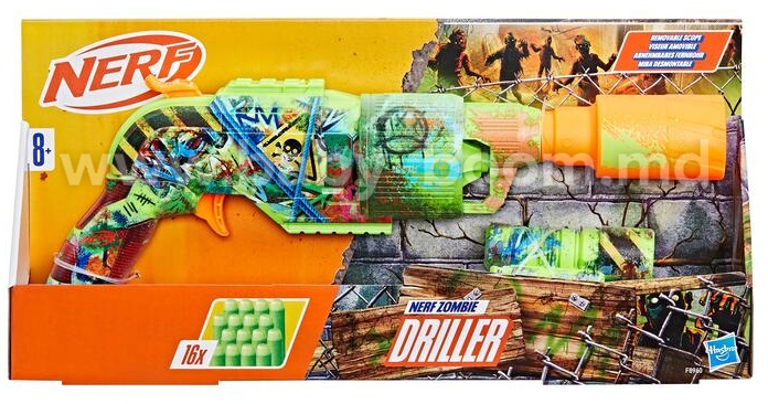 Blasterul Nerf Zombie Driller este complet decorat cu modele graffiti strălucitoare și atrăgătoare pe ambele părți. Designul blasterului creează aspectul echipamentului de luptă care ar fi folosit de luptătorii zombi într-o lume invadată de strigoii ticăloși. Zombie Driller Blaster arată ca un burghiu transformat într-un blaster pentru lupta cu zombi. Este echipat cu un cilindru rotativ pentru 5 sageti si are o vizor detasabil. Blasterul Nerf Zombie Driller oferă detalii distractive pentru iubitorii de zombi și este un accesoriu grozav pentru petreceri, jocuri și evenimente cu zombi.