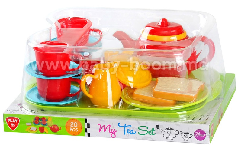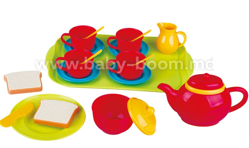 Pe cine vei invita la ceai? Acest set de ceai din 20 de piese este format din patru cești roșii cu o farfurie albastră și o lingură galbenă, un ceainic galben, un cană de lapte albastru, un vas de zahăr albastru, o farfurie verde, două sandvișuri albe și un cuțit galben. Datorită tăvii verde convenabile, nu trebuie să te plimbi tot timpul înainte și înapoi, dar poți duce totul în sufragerie dintr-o singură mișcare! Acest set de ceai de la Play este foarte potrivit pentru dezvoltarea imaginației și creativității.