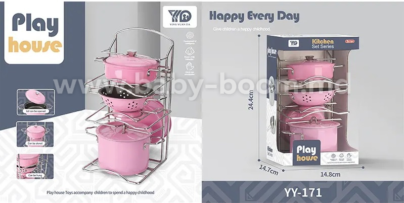 Set de joacă pentru copii cu vase metalice YY-171. Seturile de joacă pentru copii cu vase sunt folosite pentru joacă în interior sau în exterior. Setul include diverse oale și tigăi cu capace. Acest set de joacă pentru copii este fabricat din metal și are un suport. Imită ustensilele de bucătărie reale și are o culoare și un design strălucitor și atractiv. Aceste seturi dezvoltă imaginația și creativitatea copiilor, subliniind totodată importanța diverselor ustensile de bucătărie și a economisirii. Dimensiunea pachetului: 25 x 15 x 15 cm.