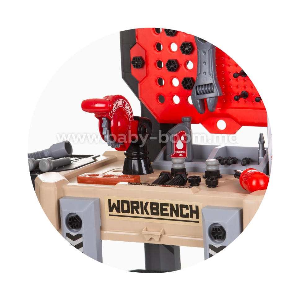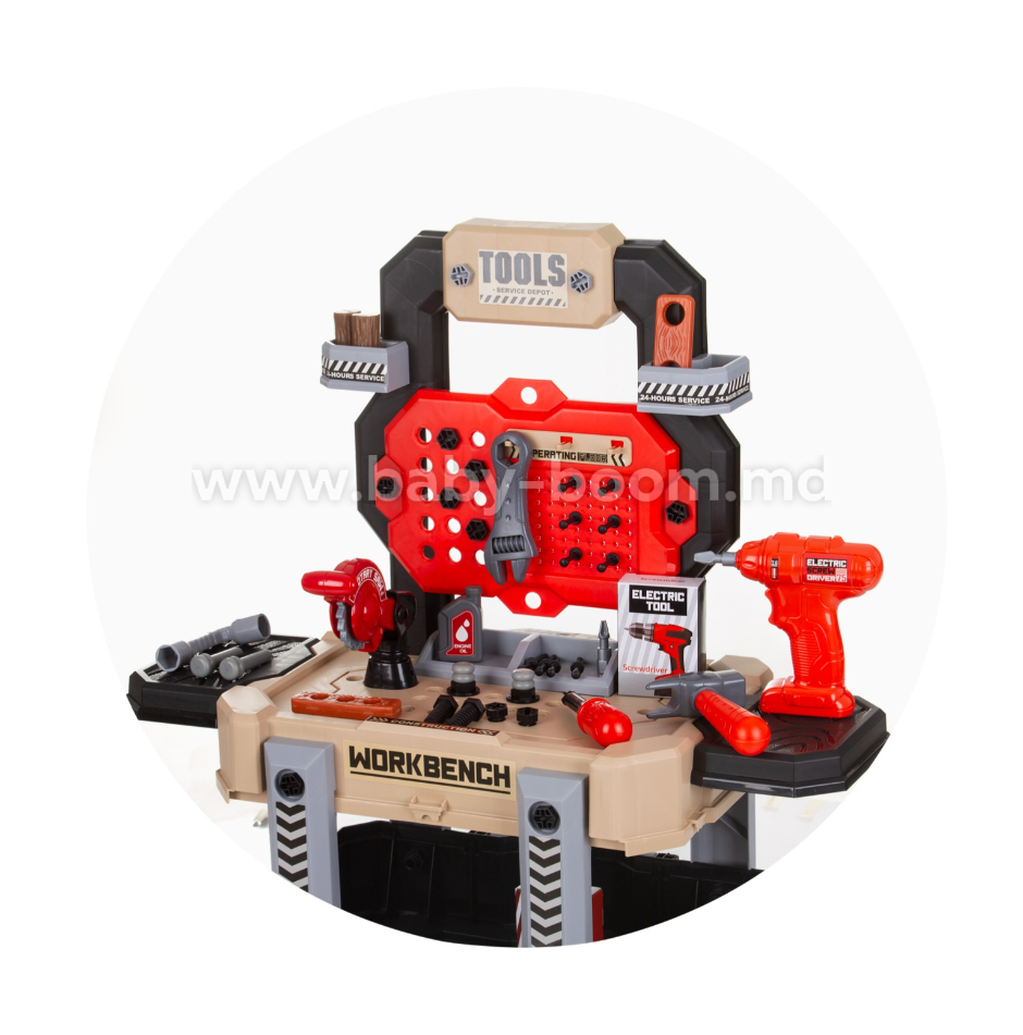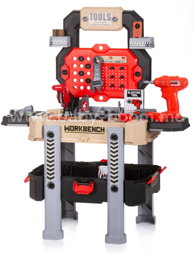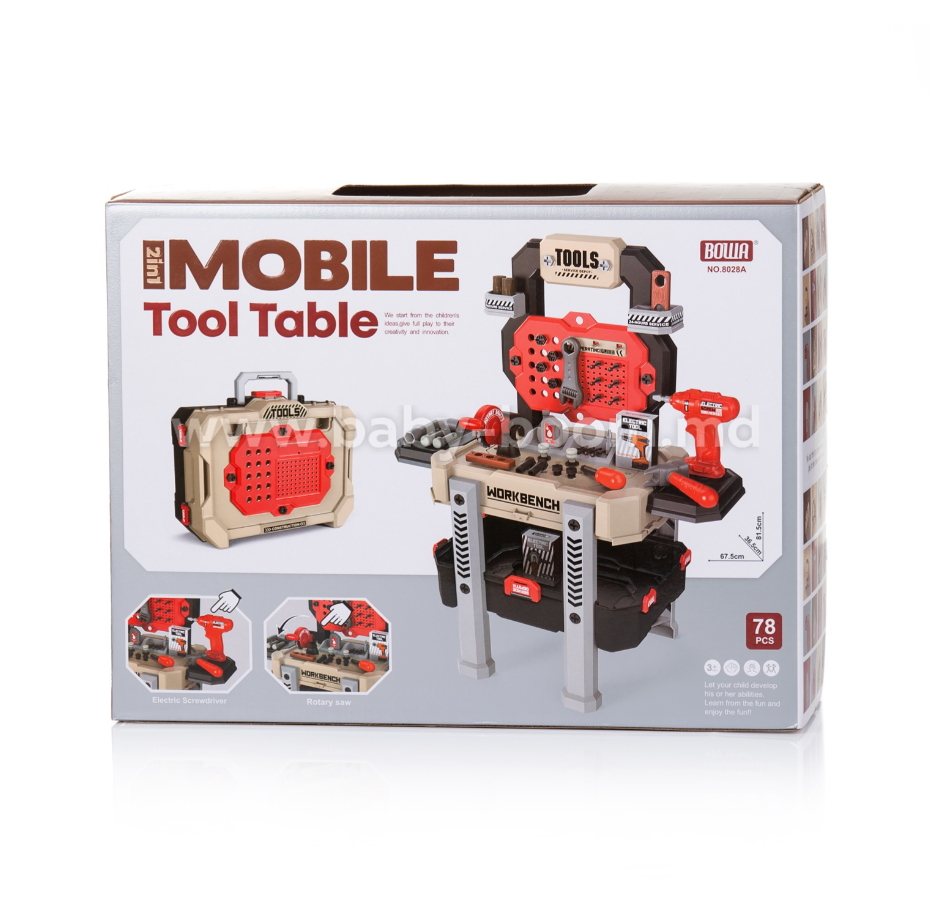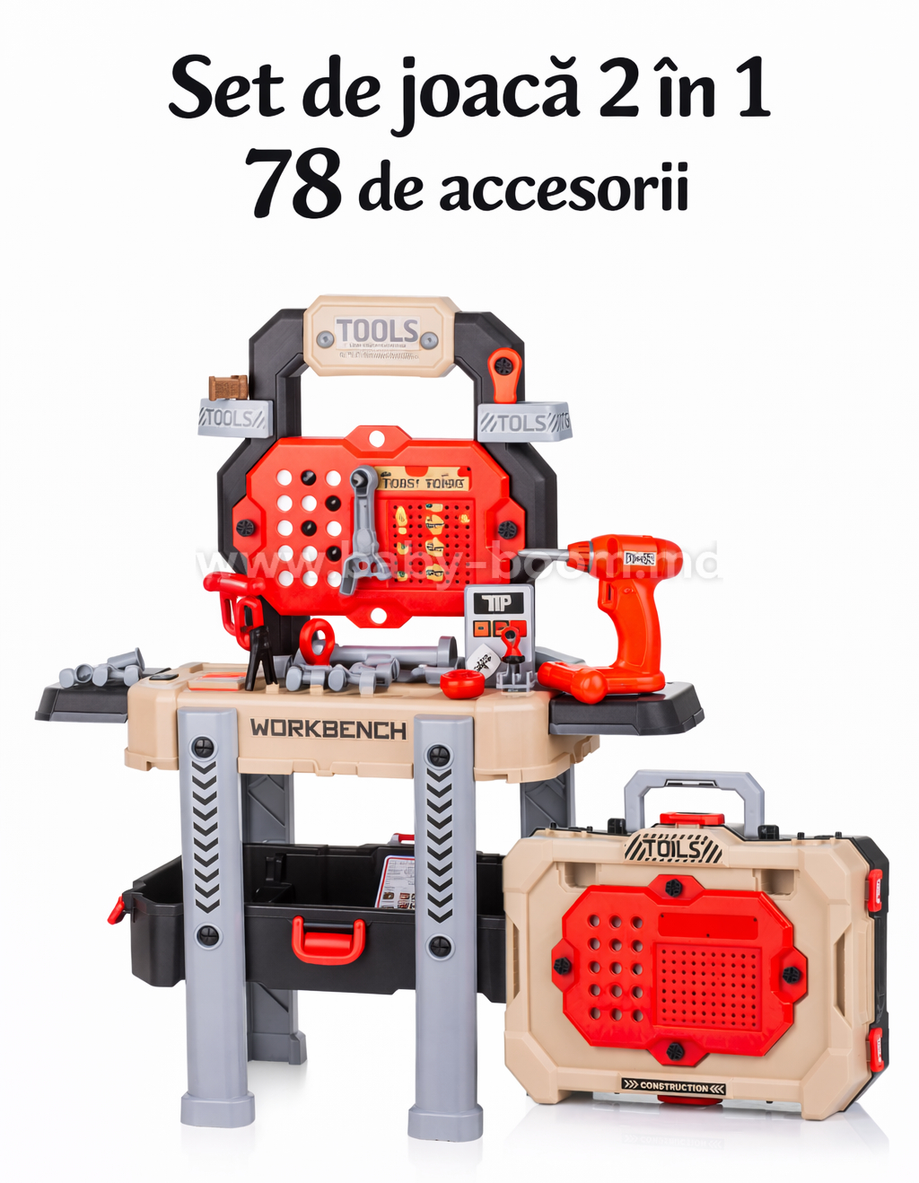 - Masa de scule se transformă cu ușurință într-o cutie de transport convenabilă, cu mâner, pentru copii.