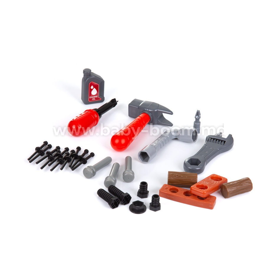 - Setul include o cutie de plastic cu diverse unelte și accesorii inginerești - o șurubelniță, un ferăstrău, șuruburi, piulițe, un ciocan și multe altele;