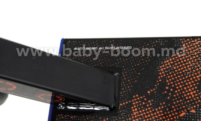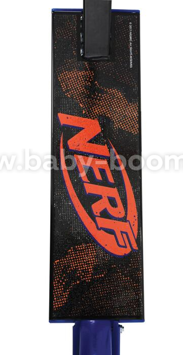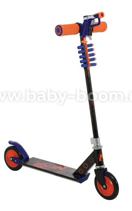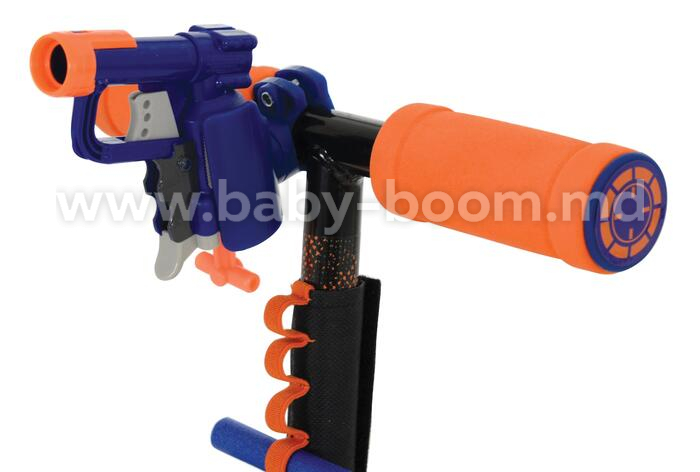 - Scuterul vine complet cu un blaster NERF montat pe ghidon și 5 pelete într-un toc rece pe tijă.