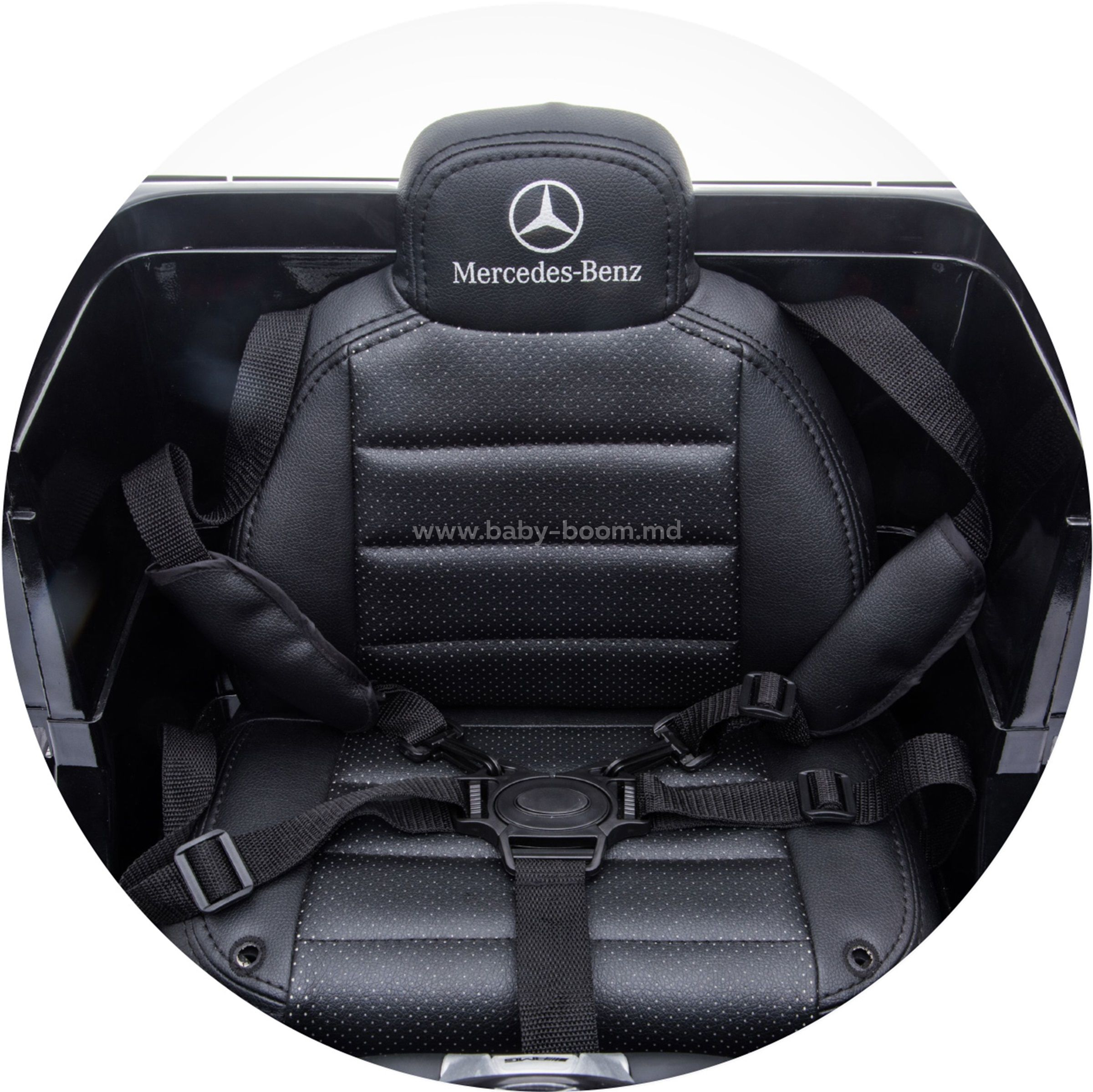 - Centuri de siguranță sigure și scaun cu spătar înalt, tapițat cu piele.
