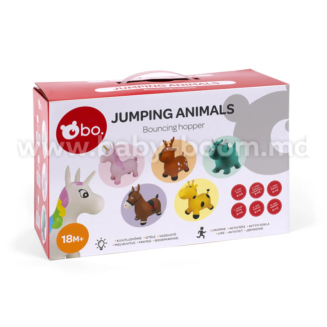 Jucărie-jumper s-a transformat acum într-un animal! BO Jumping Animal Bouncer este un tovarăș de joacă distractiv care vă permite să vă jucați în siguranță atât în ​​interior, cât și în aer liber. Coarnele sau urechile unui animal săritor acționează ca mânere pe care bebelușul le poate ține. Jumperul este ușor de umflat cu pompa de mână furnizată.