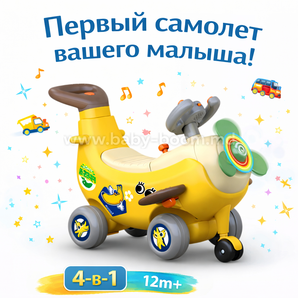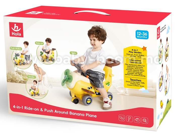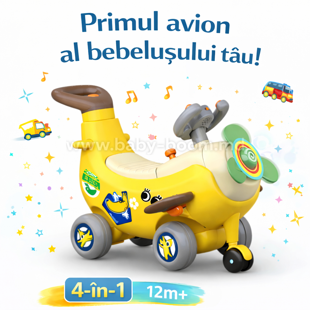 Descoperiți pentru copil lumea mișcării și distracției cu avionul interactiv 4-în-1 „Banana”! Această jucărie colorată și multifuncțională este ideală pentru copiii între 12 și 36 de luni și oferă patru moduri de utilizare: mașinuță ride-on (tolocar), premergător, jucărie de împins cu mâner pentru părinte și balansoar.