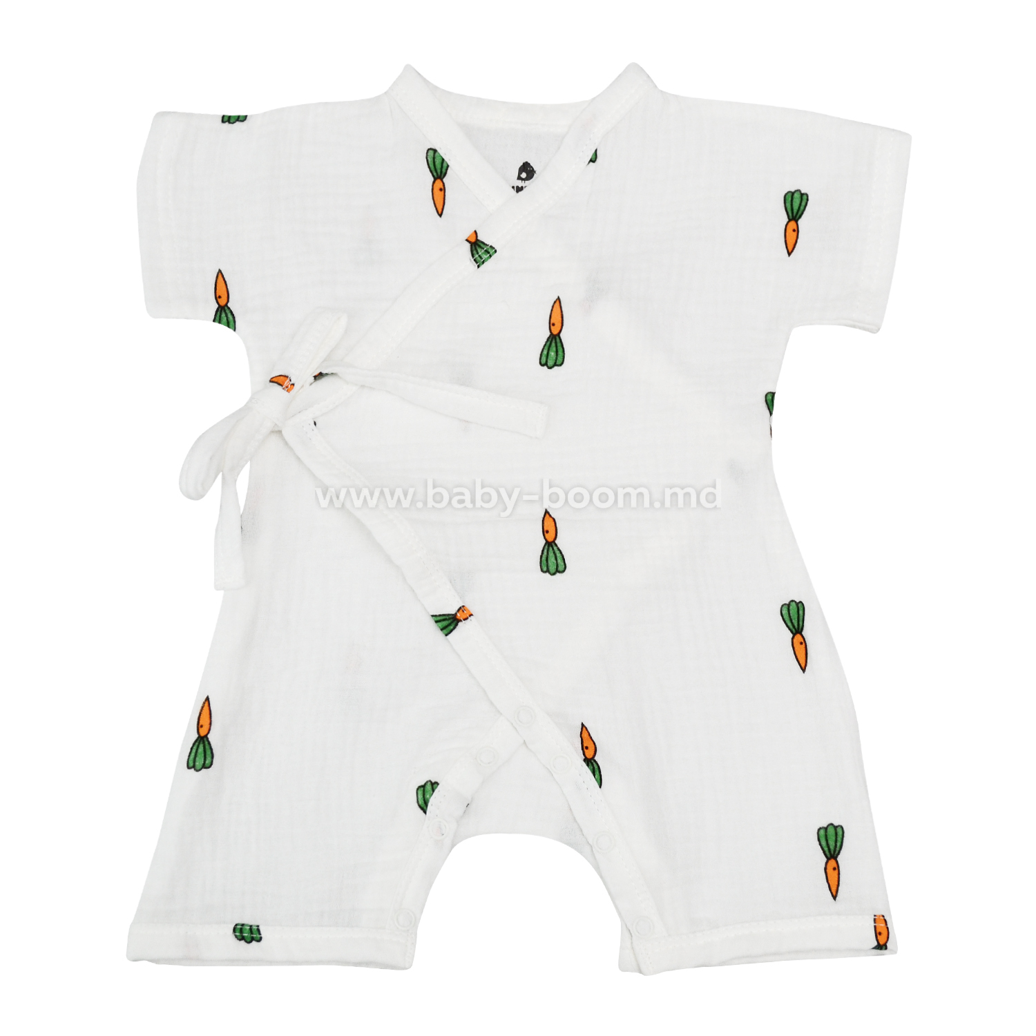Легкий песочник для ребенка сшит из муслина. Натуральный материал отлично подойдет для жарких дней. Короткий рукав и шорты не мешают ребенку активно двигаться. Застежка – между ног на кнопке, а снаружи на завязке. Эти детали позволяют легко переодевать малыша и просто менять подгузник.