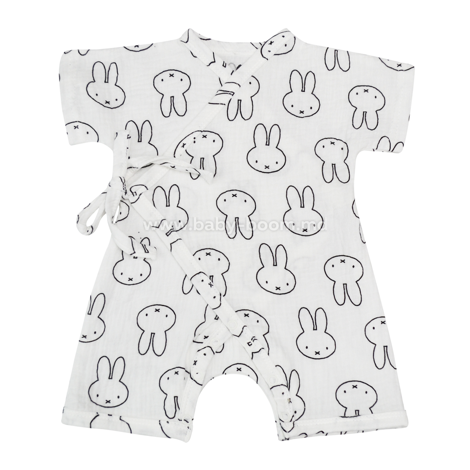 Легкий песочник для ребенка сшит из муслина. Натуральный материал отлично подойдет для жарких дней. Короткий рукав и шорты не мешают ребенку активно двигаться. Застежка – между ног на кнопке, а снаружи на завязке. Эти детали позволяют легко переодевать малыша и просто менять подгузник.