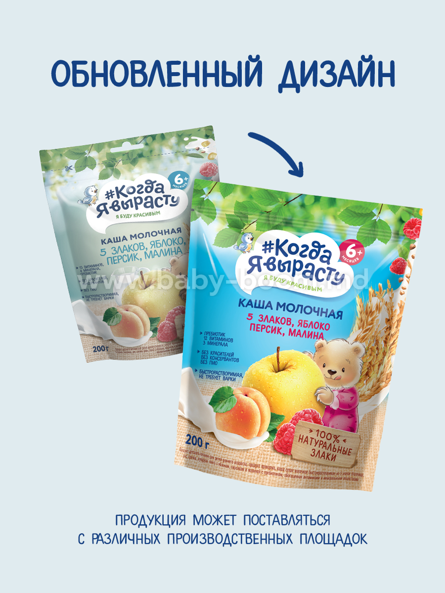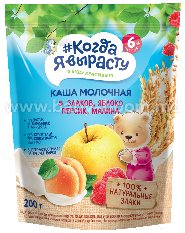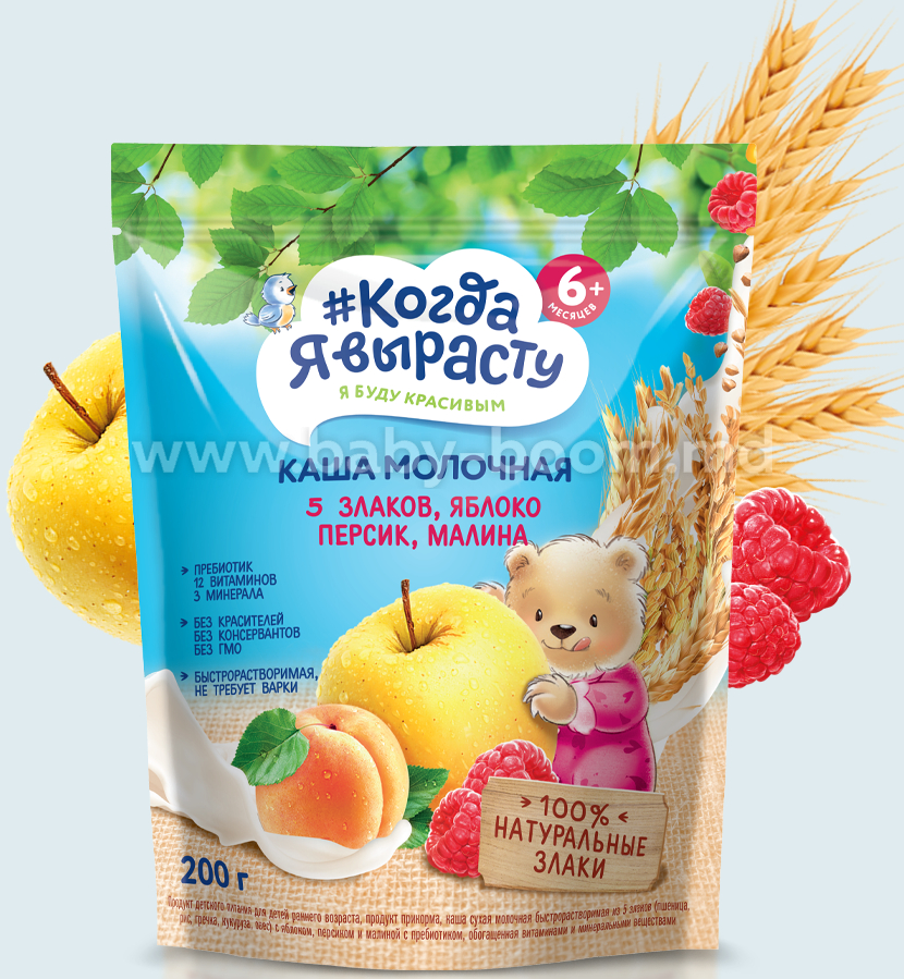 "Когда Я Вырасту" Каша молочная 5 злаков, яблоко, персик, малина - это сбалансированный и полезный продукт детского питания, рекомендованный для питания детей старше 6 месяцев. Каша обогащена пребиотиком, для улучшения пищеварения, а так же витаминами и минеральными веществами, так необходимыми малышу в этом возрасте. Каша производится на новейшем современном заводе с соблюдением высоких требований к качеству детского питания.