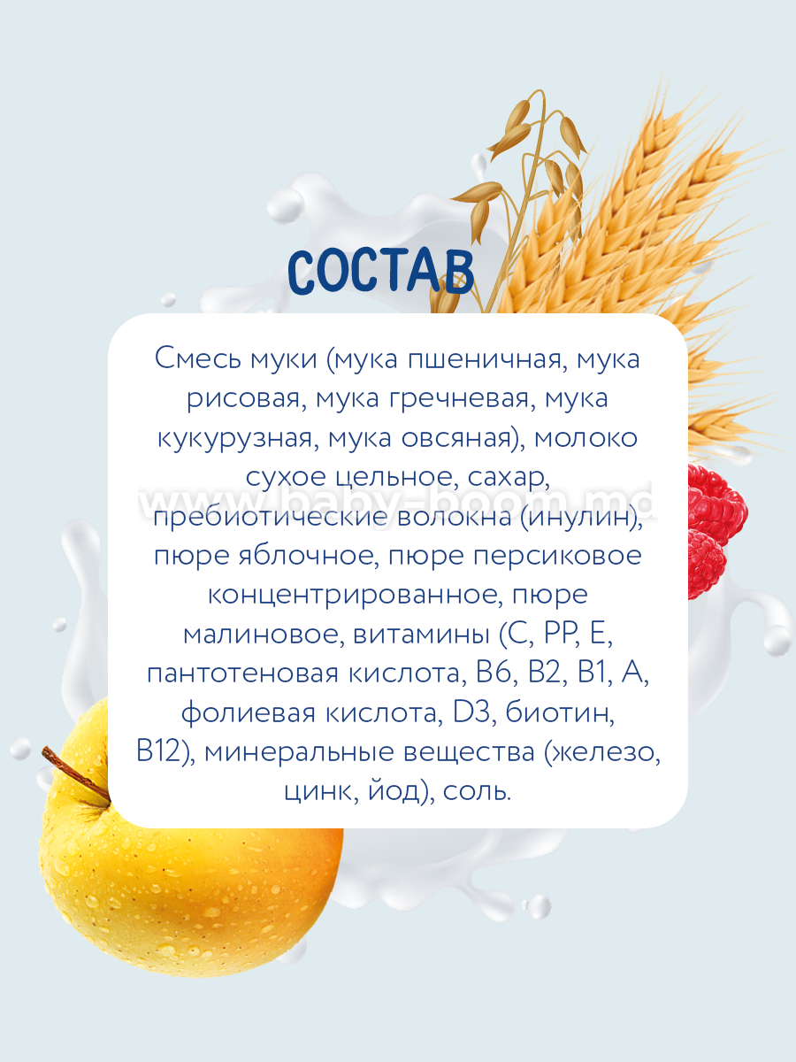 Состав: смесь муки (мука пшеничная, мука рисовая, мука гречневая, мука кукурузная, мука овсяная), молоко сухое цельное, сахар, пребиотические волокна (инулин), пюре яблочное, пюре персиковое концентрированное, пюре малиновое, витамины (C,PP,E, пантотеновая кислота, В6, В2, В1, А, фолиевая кислота,D3, биотин, В12), минеральные вещества (железо, цинк, йод), соль.