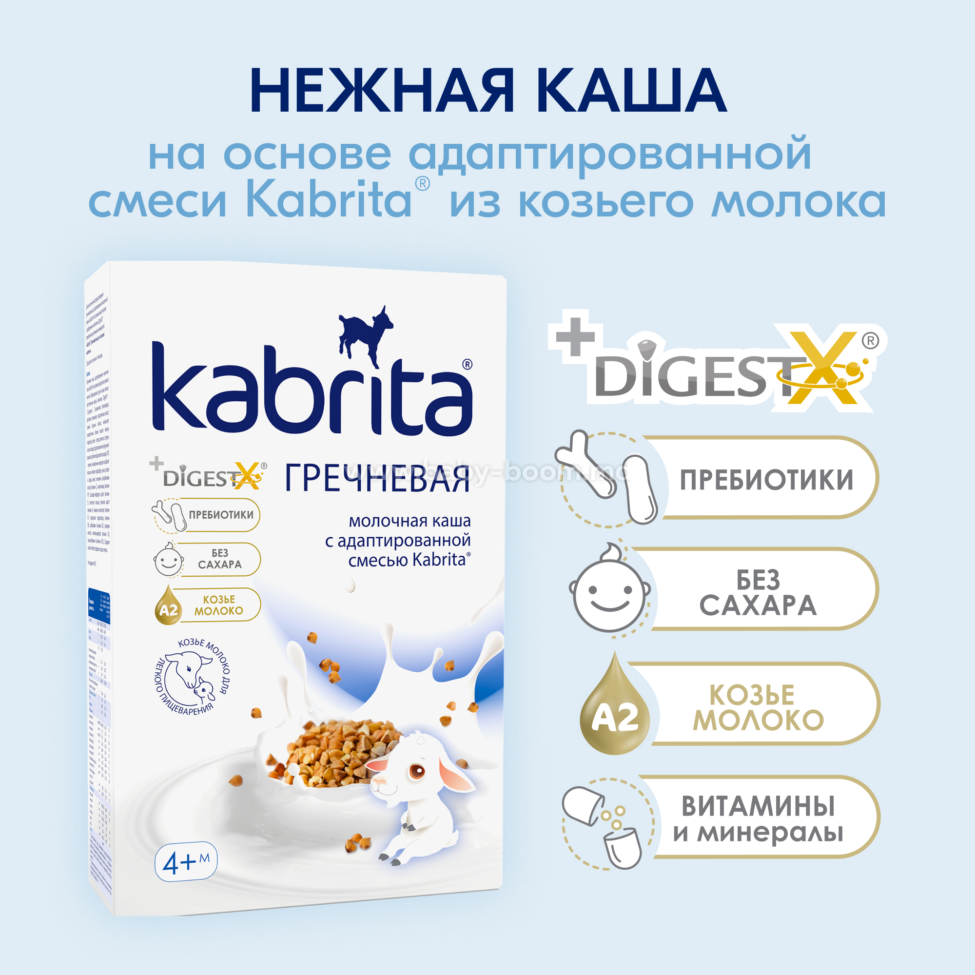 - Технология «бережного расщепления зерна» облегчает пищеварение, позволяет сохранить естественную сладость злаков. Благодаря этой технологии каши Kabrita® имеют воздушную, нежную структуру и идеально разводятся в воде.
