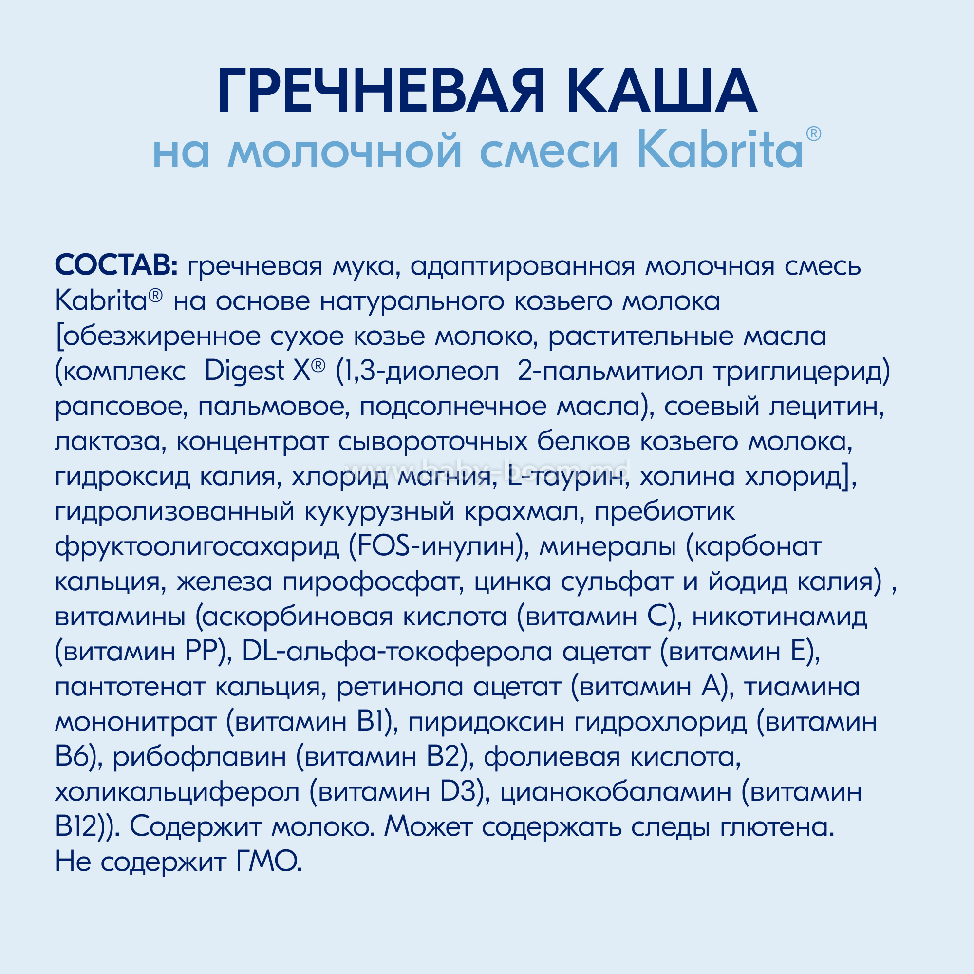 Адаптированная молочная смесь Kabrita® на основе козьего молока [сухое обезжиренное козье молоко, лактоза, растительные масла (рапсовое, подсолнечное, кокосовое), комплекс DigestX® (1,3-диолеол 2-пальмитоил триглицерид), минералы (карбонат кальция, цитрат калия, цитрат натрия, хлорид кальция, фосфат кальция, хлорид магния)], гречневая мука, лактоза, гидролизованный кукурузный крахмал, сухое обезжиренное козье молоко, фруктоолигосахарид (ФОС-инулин), минералы (карбонат кальция, пирофосфат железа, сульфат цинка, йодид калия), витамины (витамин В1 (тиамина мононитрат), витамин С (аскорбиновая кислота), витамин Е (Dl-альфа-токоферола ацетат), витамин А (ретинола ацетат), витамин PP (ниацин), витамин D3 (холикальциферол), витамин В12 (цианокобаламин), D-пантотенат кальция, фолиевая кислота, витамин В6 (пиродоксина гидрохлорид), витамин В2 (рибофлавин)).