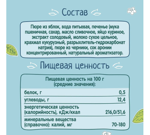 Пюре из яблок, вода питьевая, печенье (мука пшеничная, сахар, масло сливочное, яйцо куриное, экстракт солодовый, молоко сухое цельное, крахмал кукурузный, разрыхлитель-гидрокарбонат натрия), пюре из черники, сок аронии концентрированный, натуральный ароматизатор.