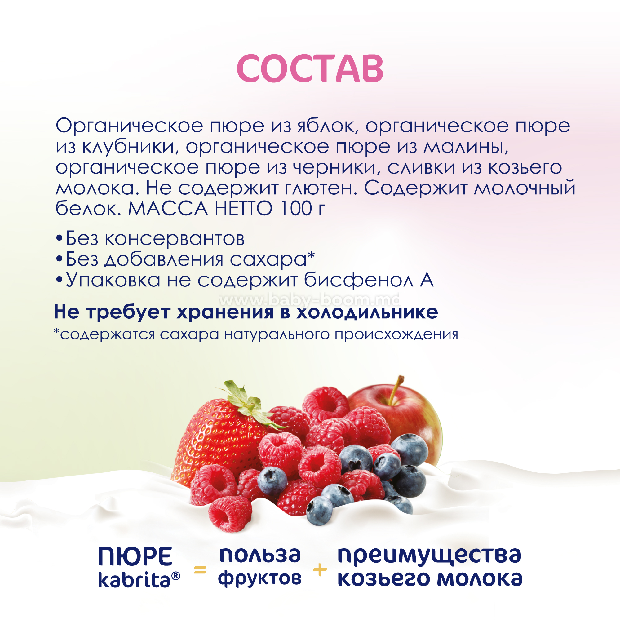 Органическое яблочное пюре, органическое клубничное пюре, органическое пюре малины, органическое пюре черники, сливки из козьего молока.