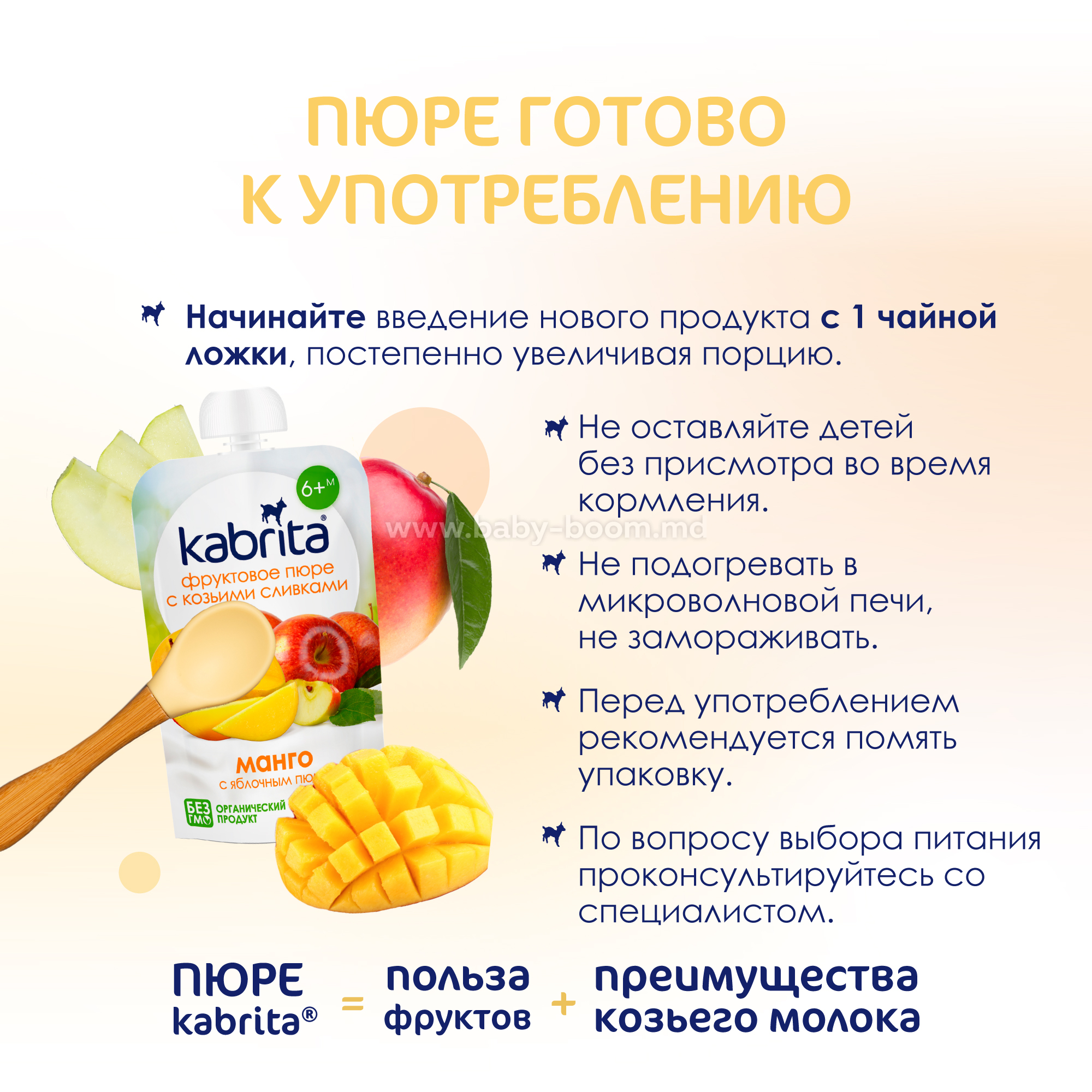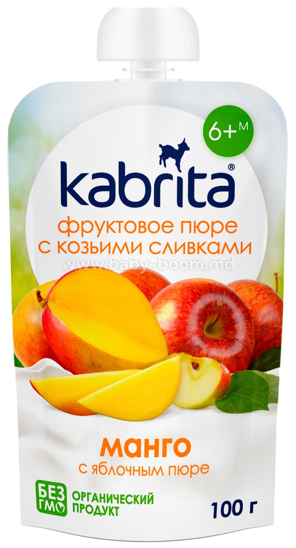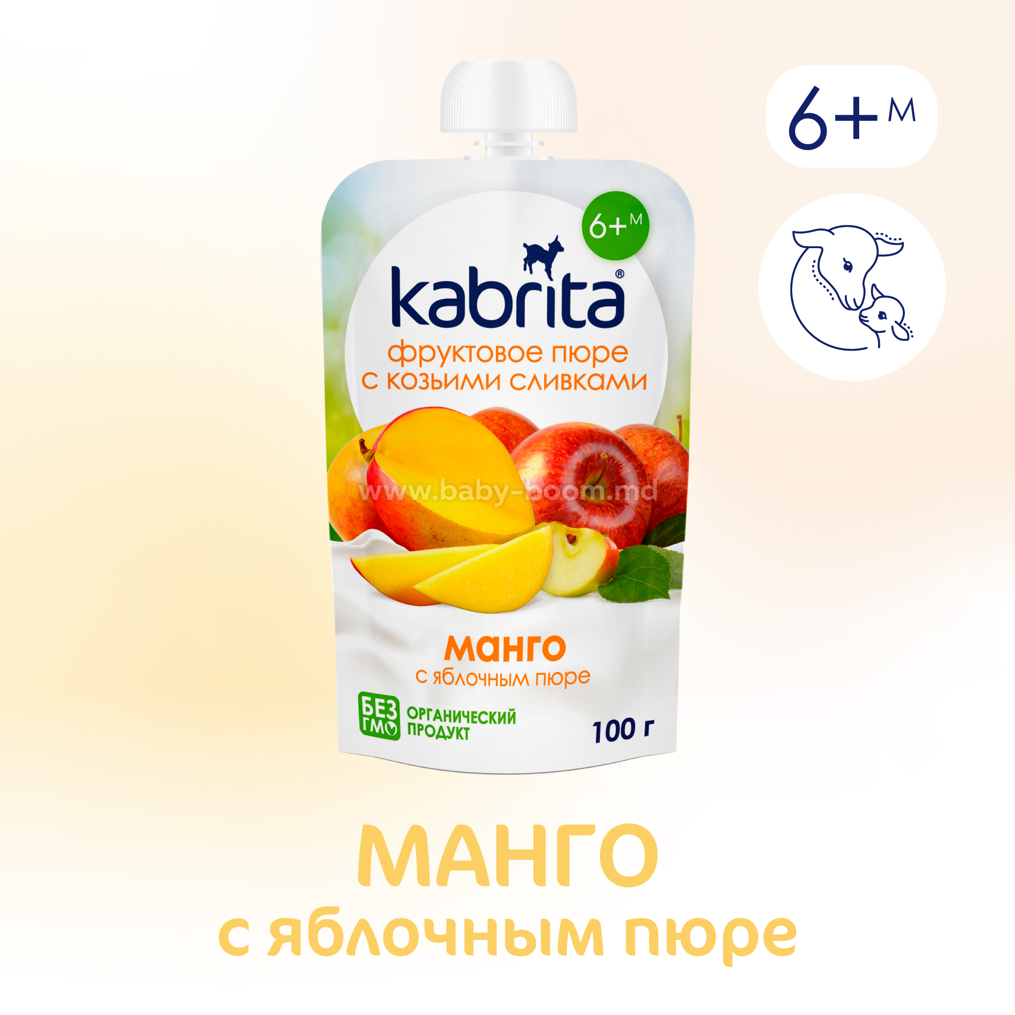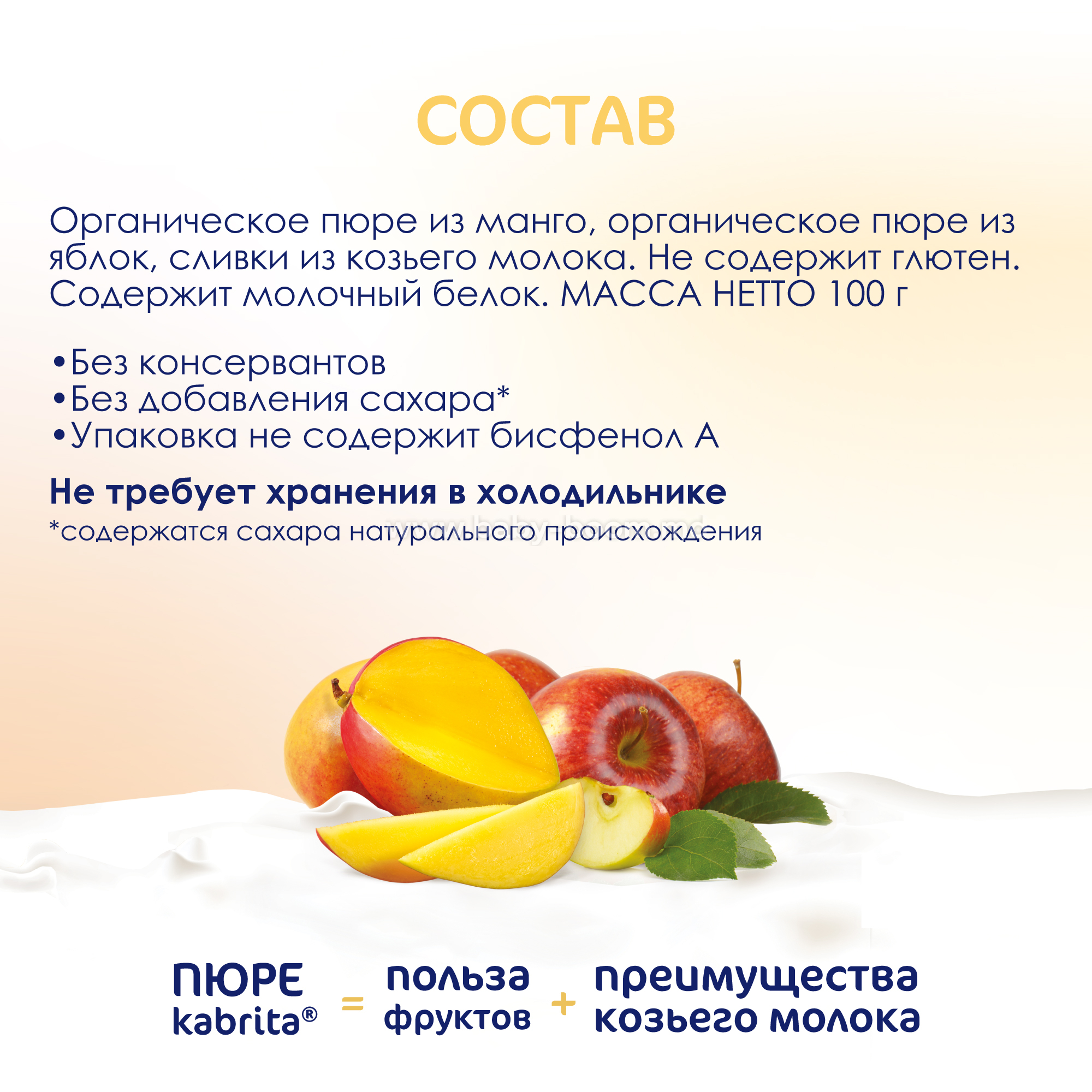Органическое пюре из манго, органическое яблочное пюре, сливки из козьего молока.